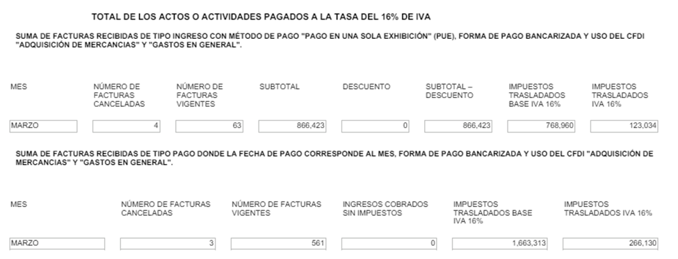 Dentro de la información que muestra en el precargado de IVA, es la cantidad de CFDIs emitidos y recibidos tipo ingreso con método de pago “Pago en una sola exhibición” (PUE) así como los CFDI de pagos emitidos y recibidos junto con los importes y algunas consideraciones, sobre todo en los CFDIs recibidos, que afectan directamente al IVA acreditable.