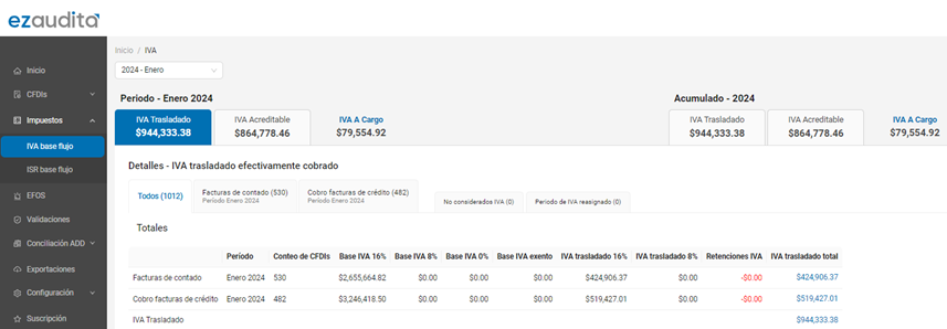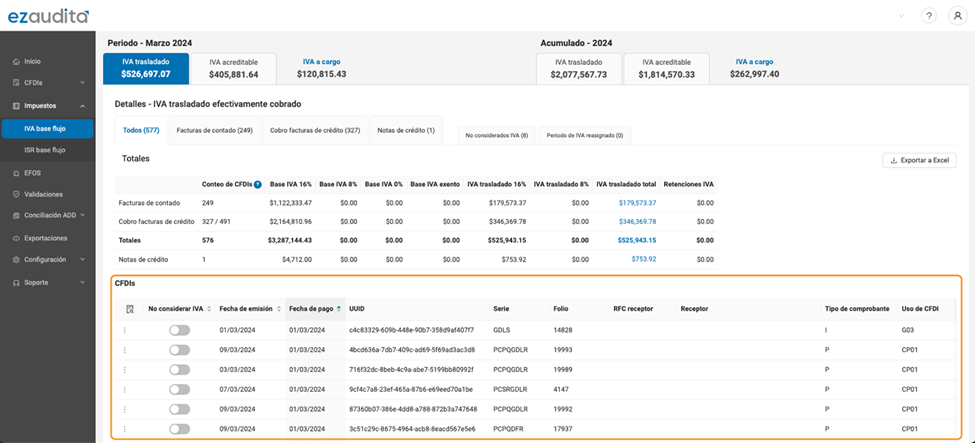 Además, ezaudita® te permite obtener el detalle del cálculo de IVA trasladado y acreditable por tipo de comprobante, ya sean facturas de contado con método de pago PUE (pago en una sola exhibición) y CFDIs de pagos considerando la fecha de pago como lo genera el SAT: